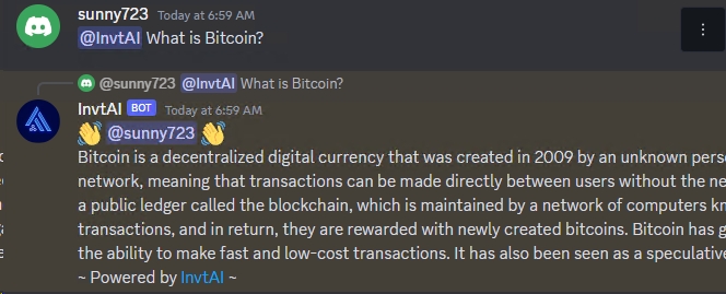 Ask a question to the InvtAi Bot in your Telegram group or Discord channel.